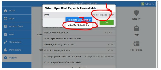 Click on Prompt to Load Paper and change to Letter/A4 Substitution then press OK and log out